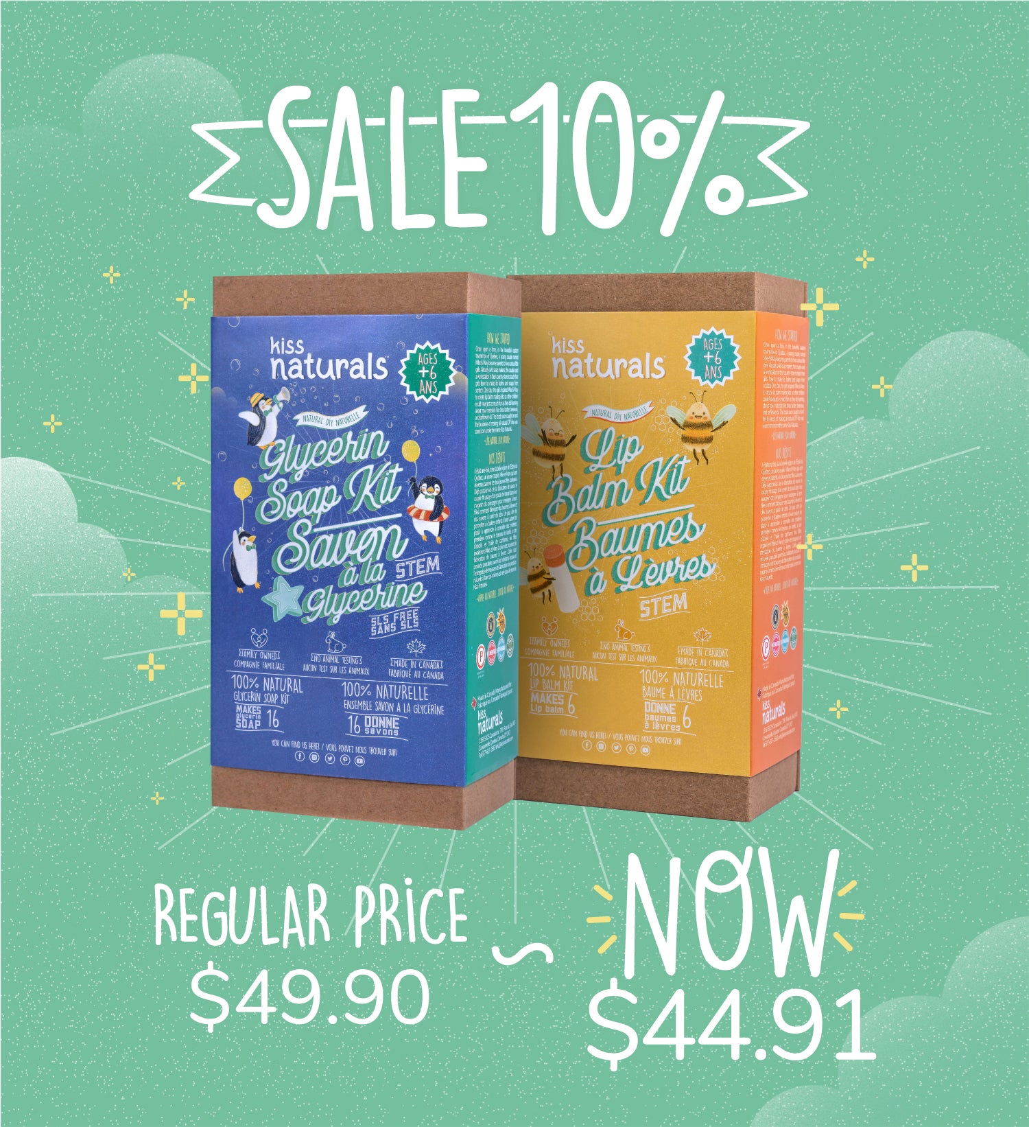 Profitez de la livraison gratuite tout en économisant sur cet ensemble avantageux de nos kits les plus vendus ! Ce lot comprend 1 kit de baume à lèvres Kiss Naturals DIY et 1 kit de savon à la glycérine Kiss Naturals. Obtenez tout ce dont vous avez besoin pour une journée de bricolage amusante à la maison.